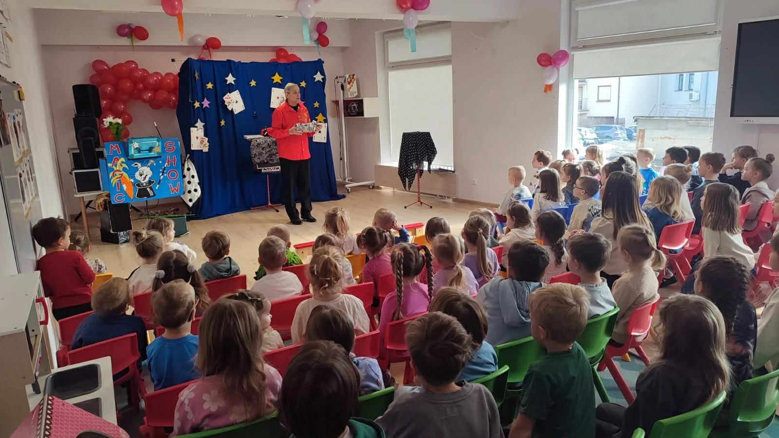 Pokaz iluzjonisty!!! Przeniósł dzieci w świat magii i niesamowitych sztuczek! Już od pierwszych chwil mali widzowie z ogromnym zainteresowaniem obserwowali występ pełen zaskakujących trików, znikających przedmiotów i tajemniczych przemian.