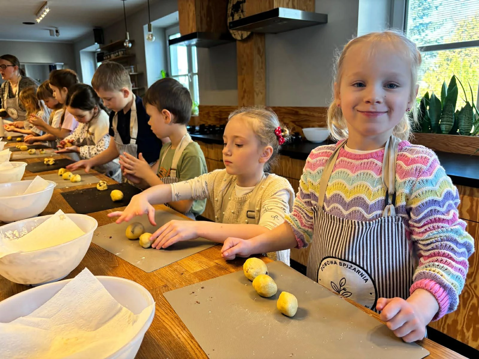 Dzieci z grupy V w ramach obchodów Dnia Kobietwzięły udział w warsztatach kulinarnych w Studio Domowej Spiżarni. Atrakcję tę zorganizowali rodzice :-). Dzieci podczas zajęć miały okazję samodzielnie przygotować dwie potrawy – kopytka oraz ciasteczka z kawałkami czekolady. Najpierw poznały składniki i sposób przygotowania potraw, a następnie każdy uczestnik samodzielnie wykonał swoje zadanie przy własnym stanowisku pracy.Najwięcej radości sprawiło formowanie kopytek oraz mieszanie składników na ciasteczka. Dzieci z zaangażowaniem wyrabiały ciasto, kroiły kopytka i przygotowywały ciasteczka do pieczenia. Najlepszą częścią było oczywiście ich wspólne zjedzenie. Warsztaty były ciekawym doświadczeniem i sprawiły dzieciom dużo satysfakcji z własnoręcznie wykonanej pracy.